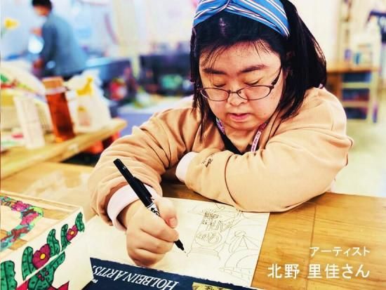 〜アーティスト北野 里佳(きたの りか)さんの紹介〜インテリアや雑貨の本を参考に、クラフト紙や画用紙につながったり離れたりする独特の輪郭を描き、色鉛筆で少しずつ塗り進める。部分部分で決まった方向に色鉛筆を走らせる筆跡が独特。近年は暖色系の優しい印章の作品を多く描く。