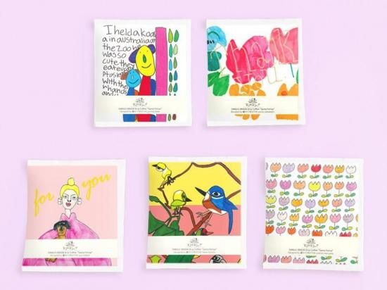 池田 ジャスティーヌさん、筧 純爾さん、水野 貴男さん、森山 幸美さん、山本 頼子さん、5人のアーティストの作品が、フェアトレードチョコレートとドリップコーヒーのパッケージになりました。